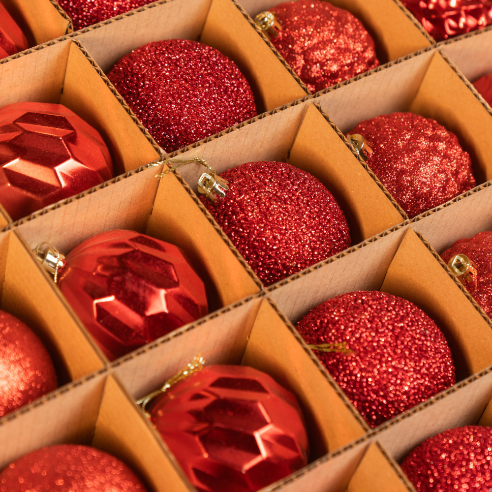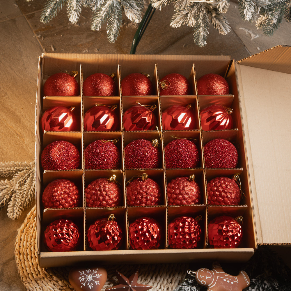 Цей набір святкових ялинкових кульок включає 25 витончених прикрас у стриманих відтінках червоного та багряного кольорів. Кульки мають різноманітні текстури та дизайни: блискучі, матові, дзеркальні та з рельєфною поверхнею, що додає глибини й елегантності вашій новорічній ялинці. Виготовлені з якісного пластику, вони є легкими та безпечними для використання як у домі, так і на відкритому повітрі. Ідеально підходять для створення сучасного та стильного святкового декору. Кожна кулька має міцну петлю для підвішування. Поставляються у зручній упаковці для зберігання.