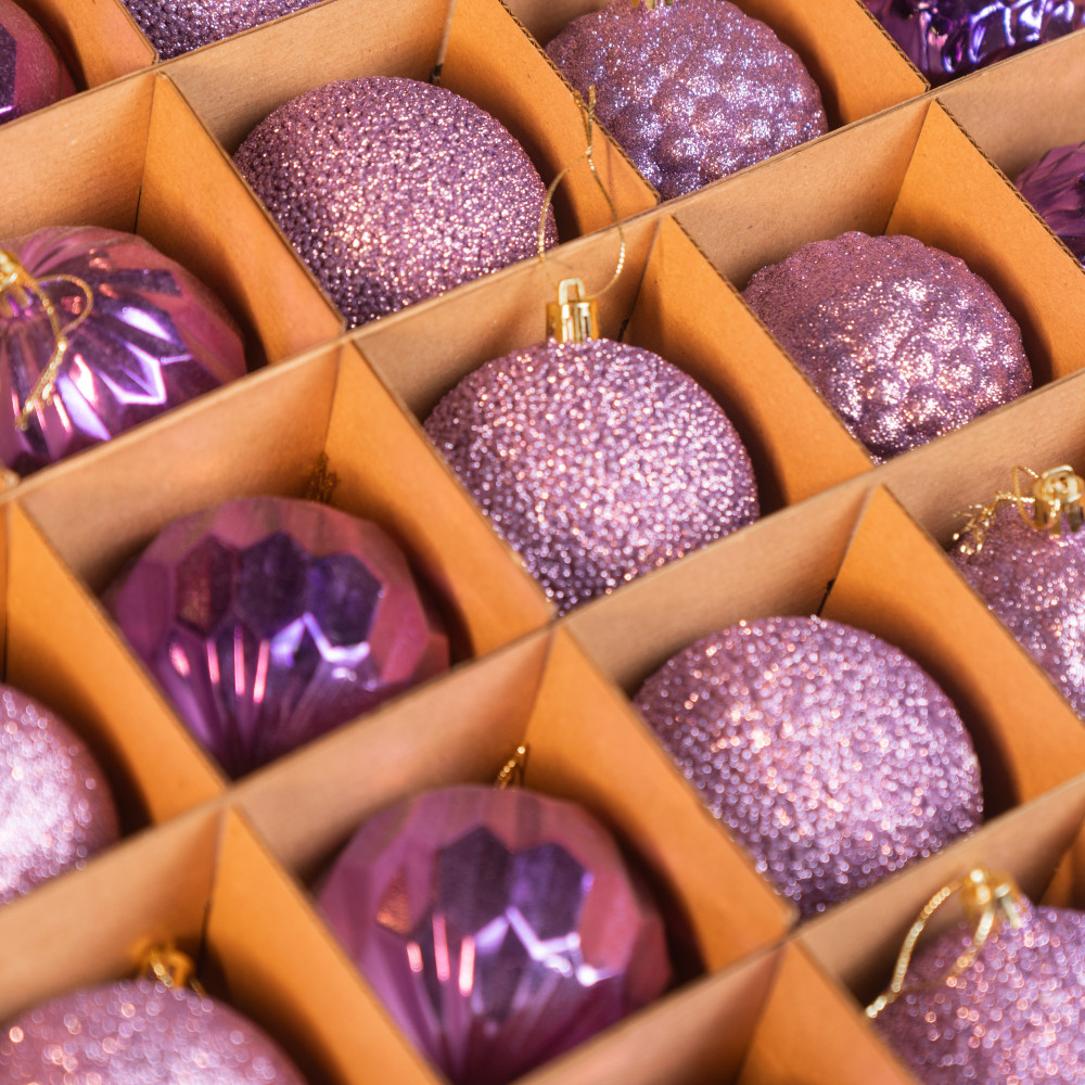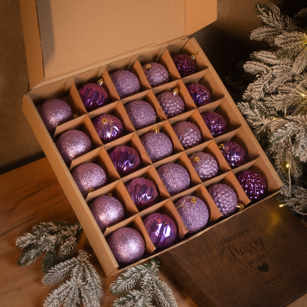 Цей набір святкових ялинкових кульок включає 25 витончених прикрас у стриманих відтінках фіолетового та лілового кольорів. Кульки мають різноманітні текстури та дизайни: блискучі, матові, дзеркальні та з рельєфною поверхнею, що додає глибини й елегантності вашій новорічній ялинці. Виготовлені з якісного пластику, вони є легкими та безпечними для використання як у домі, так і на відкритому повітрі. Ідеально підходять для створення сучасного та стильного святкового декору. Кожна кулька має міцну петлю для підвішування. Поставляються у зручній упаковці для зберігання.