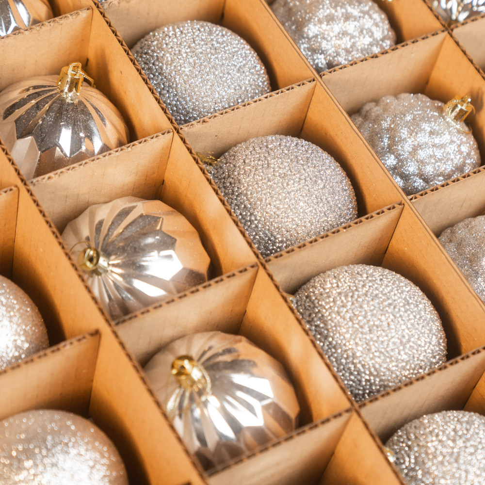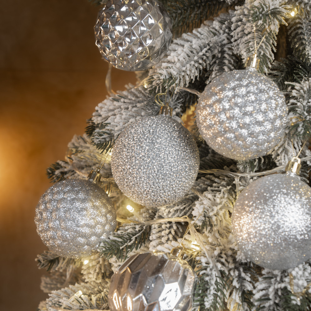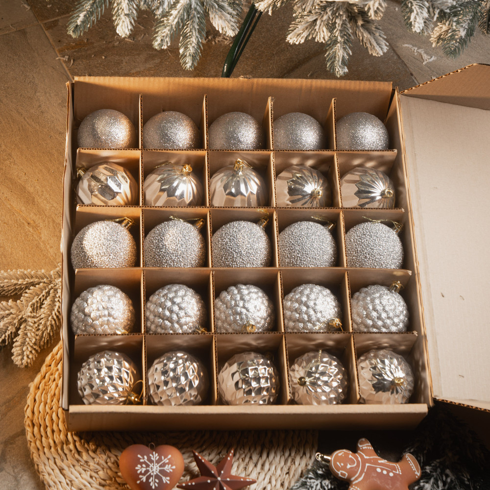 Цей набір святкових ялинкових кульок включає 25 витончених прикрас у стриманих відтінках сірого та срібного кольорів. Кульки мають різноманітні текстури та дизайни: блискучі, матові, дзеркальні та з рельєфною поверхнею, що додає глибини й елегантності вашій новорічній ялинці. Виготовлені з якісного пластику, вони є легкими та безпечними для використання як у домі, так і на відкритому повітрі. Ідеально підходять для створення сучасного та стильного святкового декору. Кожна кулька має міцну петлю для підвішування. Поставляються у зручній упаковці для зберігання.