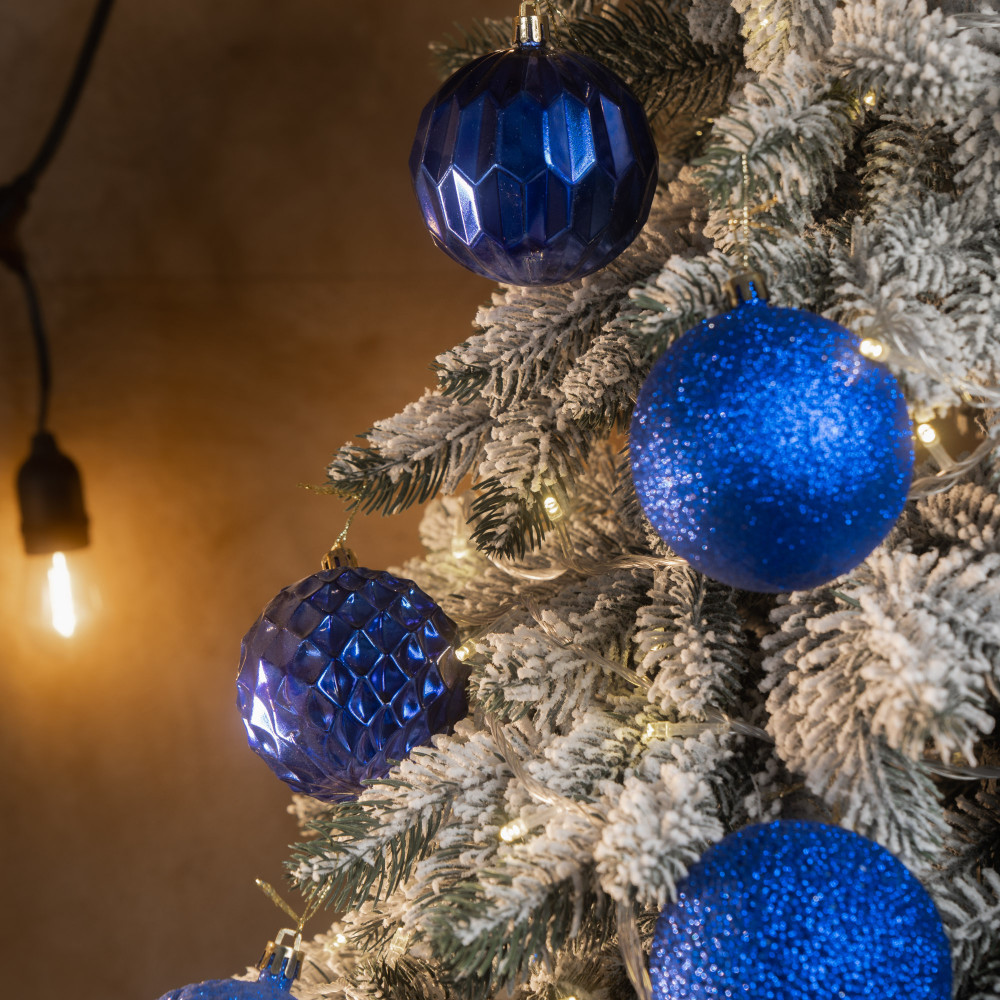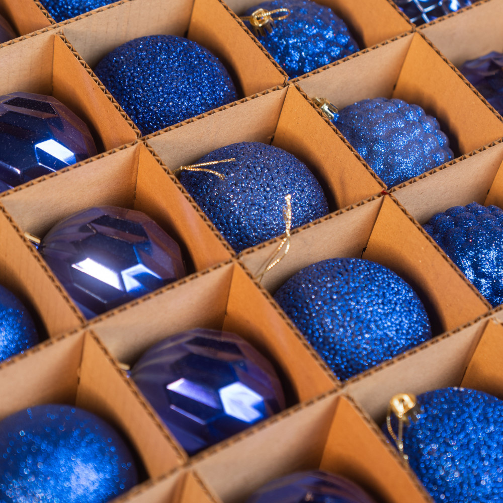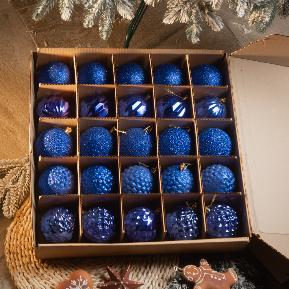 Цей набір святкових ялинкових кульок включає 25 витончених прикрас у стриманих відтінках синього та лазурового кольорів. Кульки мають різноманітні текстури та дизайни: блискучі, матові, дзеркальні та з рельєфною поверхнею, що додає глибини й елегантності вашій новорічній ялинці. Виготовлені з якісного пластику, вони є легкими та безпечними для використання як у домі, так і на відкритому повітрі. Ідеально підходять для створення сучасного та стильного святкового декору. Кожна кулька має міцну петлю для підвішування. Поставляються у зручній упаковці для зберігання.