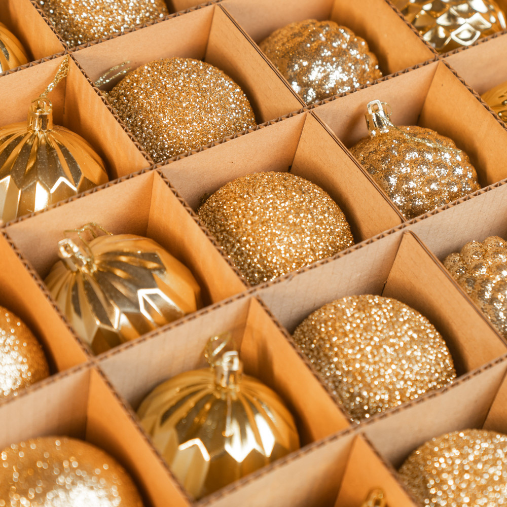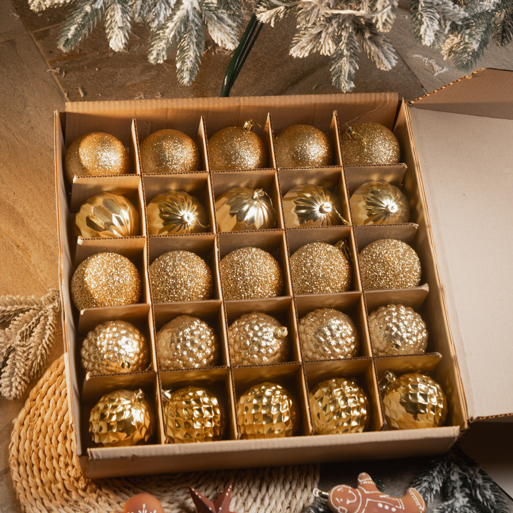 Цей набір святкових ялинкових кульок включає 25 витончених прикрас у стриманих відтінках золотого та жовтого кольорів. Кульки мають різноманітні текстури та дизайни: блискучі, матові, дзеркальні та з рельєфною поверхнею, що додає глибини й елегантності вашій новорічній ялинці. Виготовлені з якісного пластику, вони є легкими та безпечними для використання як у домі, так і на відкритому повітрі. Ідеально підходять для створення сучасного та стильного святкового декору. Кожна кулька має міцну петлю для підвішування. Поставляються у зручній упаковці для зберігання.