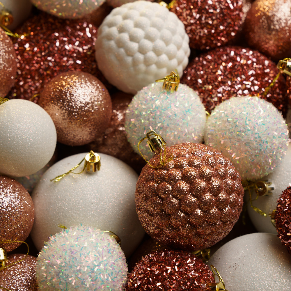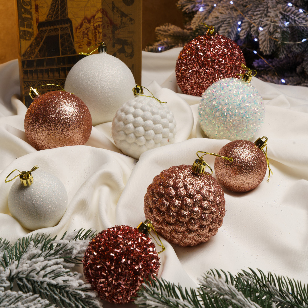 Різноманітність текстур: Кулі, покриті блискітками на посіченою мішурою 3 розмірів у 2 відтінках придадуть твоїй ялинці особливої чарівності.
