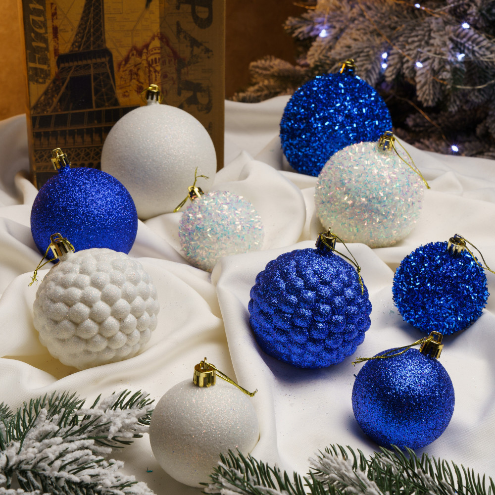 Різноманітність текстур: Кулі, покриті блискітками на посіченою мішурою 3 розмірів у 2 відтінках придадуть твоїй ялинці особливої чарівності.