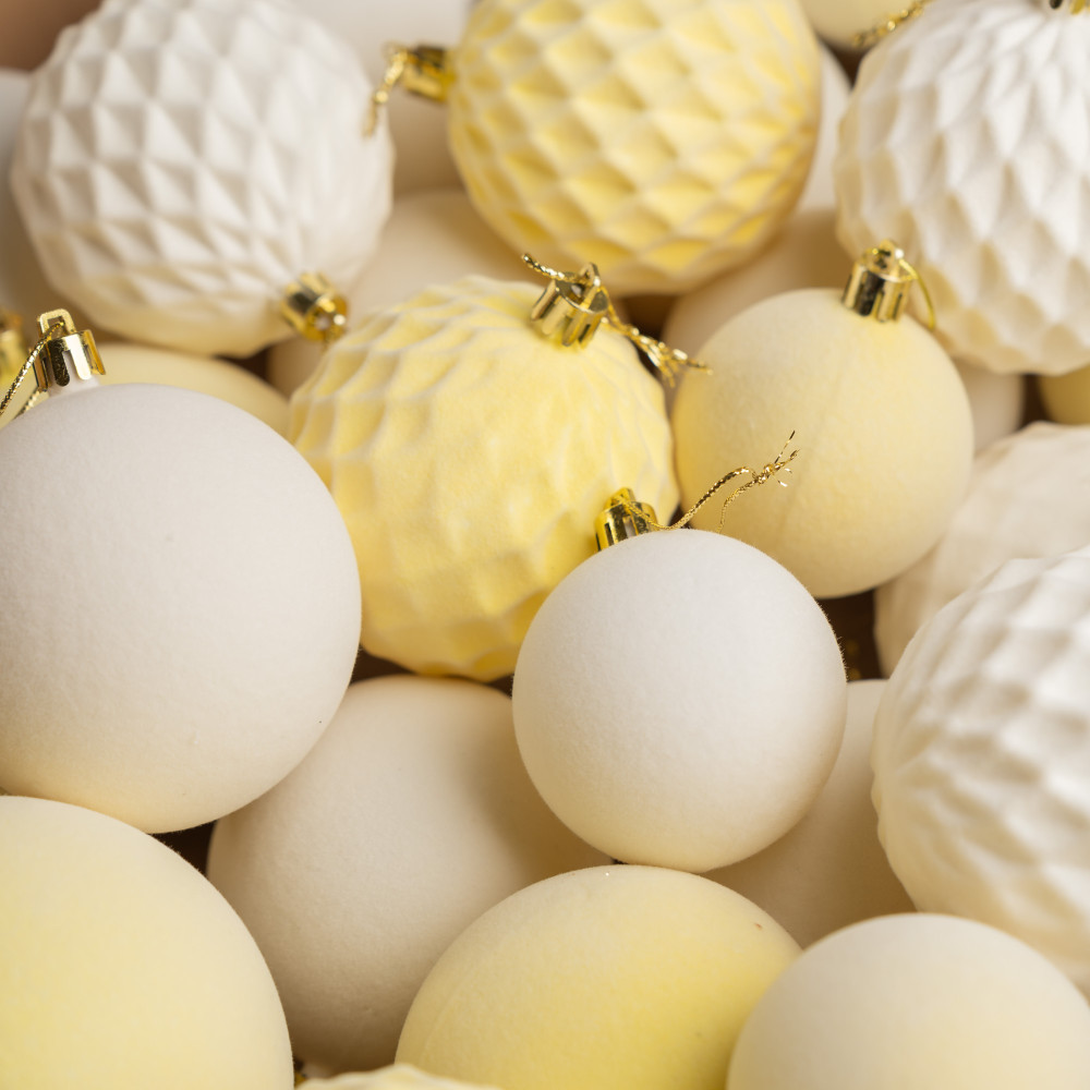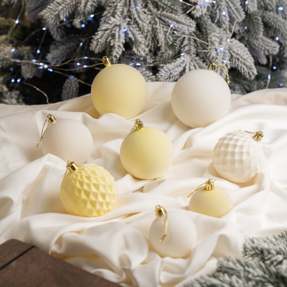 Різноманітність текстур: Оксамитові кулі 3 розмірів у 2 відтінках придадуть твоїй ялинці особливої чарівності.