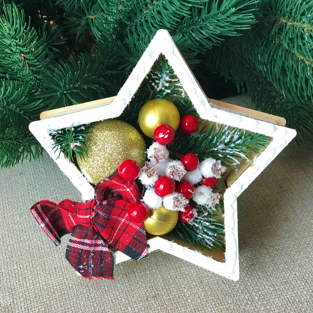 Композиція декорована литою гілочкою ялинки, кулями, бантиком, мішковиною. Міцний декор. Є приємний запах дерева.