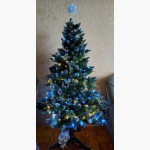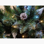Ялинка дуже гарна, пишна та святкова. Шишечки з блискітками та білі кінчики на гілочках роблять її дуже нарядною.